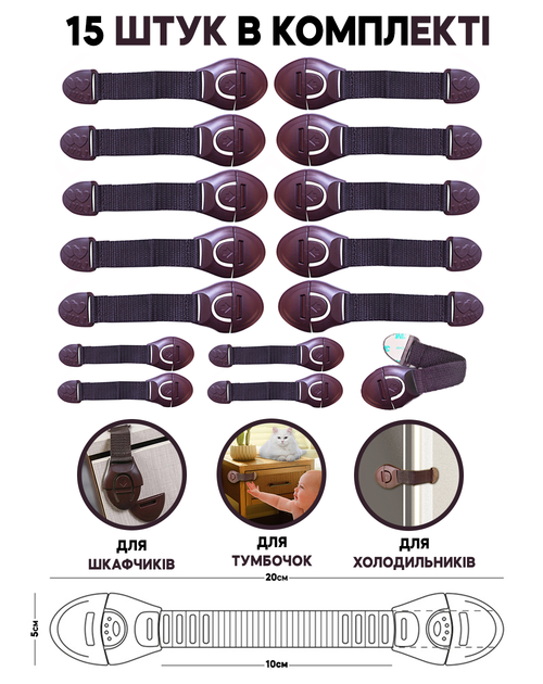 Замки безпеки набір 15 шт Замок блокатор на меблі від дітей Vela універсальні тканинні гнучкі Коричневий