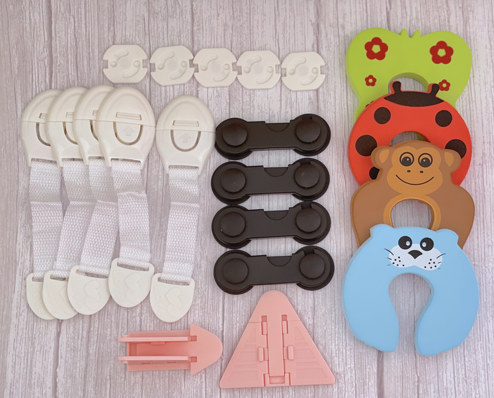 Набір дитячого захисту 20 предметів: білі тканинні замки, стопор-обмежувач дверей, заглушки для розеток, замки-гачки, блокір