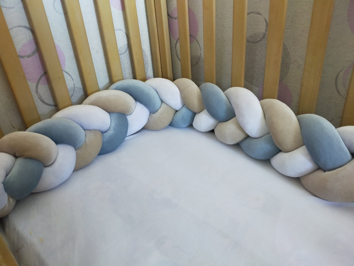 Бортик у кроватку Затишний Стиль трипрядна косічка 120*18см білий-сірий-бежевий