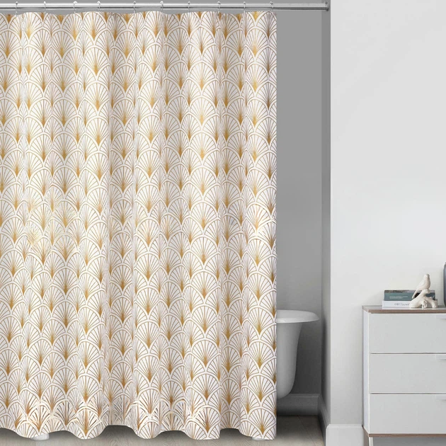 Шторка для ванної та душа 180x180 см, фіранка для ванної кімнати з гачками, біла із золотистим візерунком.