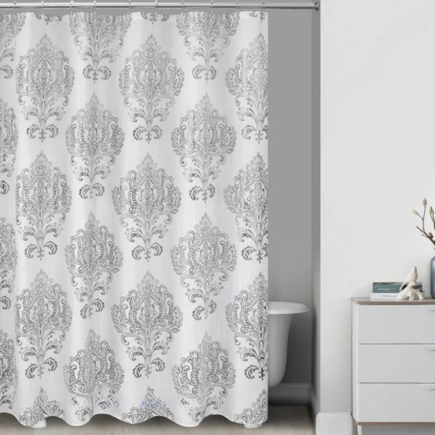 Шторка для ванної та душу 180x180 см, фіранка для ванної кімнати з гачками, біла зі сріблястим візерунком