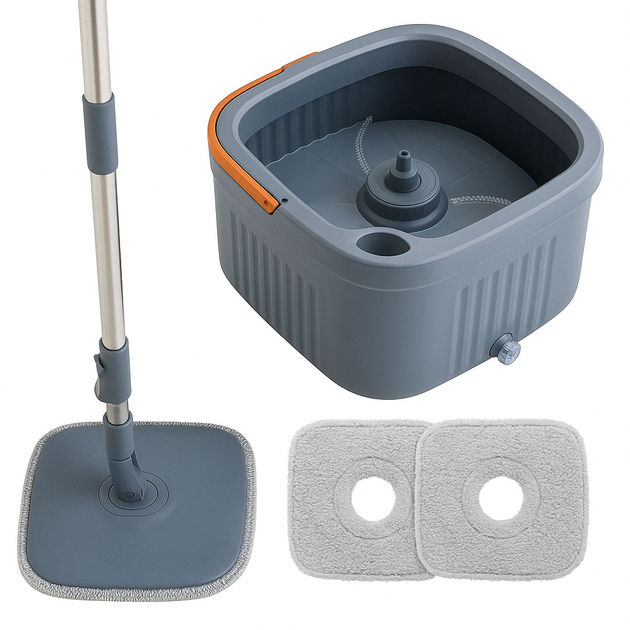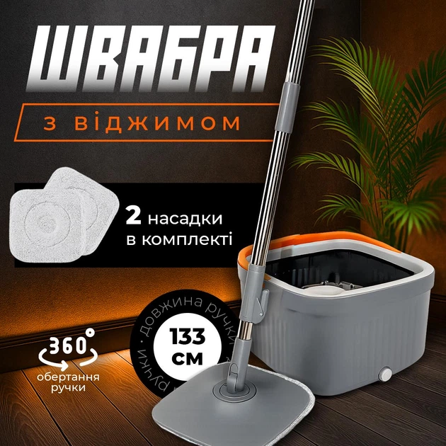 Швабра 3-в-1 з вертикальним віджиманням і відром 6 л, самоочищення, телескопічна ручка, 2 насадки, сіро-помаранчевий дизайн
