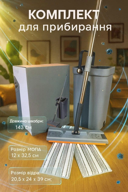 Комплект швабра з відром для миття підлог, Відділення води, Самоочищення швабра для ручного миття з 2 насадками з мікрофібри