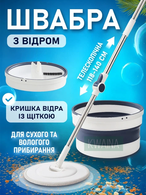 Універсальна швабра з круглим відром для сухого та вологого прибирання, телескопічна ручка 118-140 см, біла