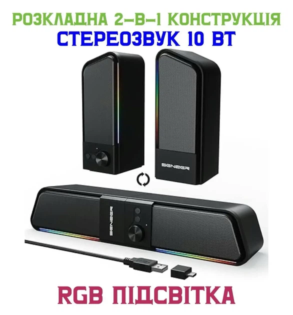 Комп’ютерні колонки SENZER CS20 — 2-в-1 Bluetooth + USB, стереозвук 10 Вт, RGB підсвітка, регулювання гучності