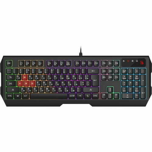 Ця клавіатура є повнорозмірною і має традиційну форму. Оснащена яскравим підсвічуванням клавіш з можливістю регулювання яскравості та доповнена системою захисту від потрапляння рідини. Особливості Регульоване підсвічування. Ефекти підсвічування: FN + F12 (Суцільний / Дихання / Вимк.) Яскравість: FN + ^/v 9 програмованих кнопок. Налаштуйте свою гру за допомогою 9 індивідуально