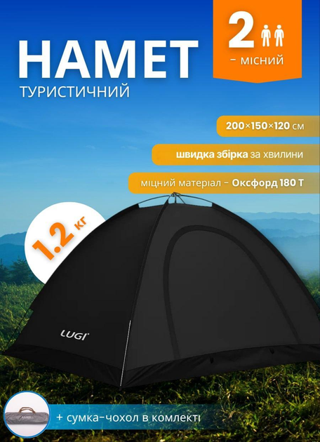 Туристичний намет для кемпінгу 2-місний 200х150х120 см кемпінговий з тентом від сонця і дрібного дощу Чорний