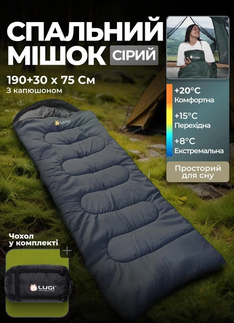 Спальний мішок ковдра 220 см LUGI спальник з капюшоном туристичний легкий для кемпінгу з чохлом натуральний наповнювач 5-20