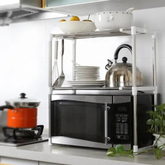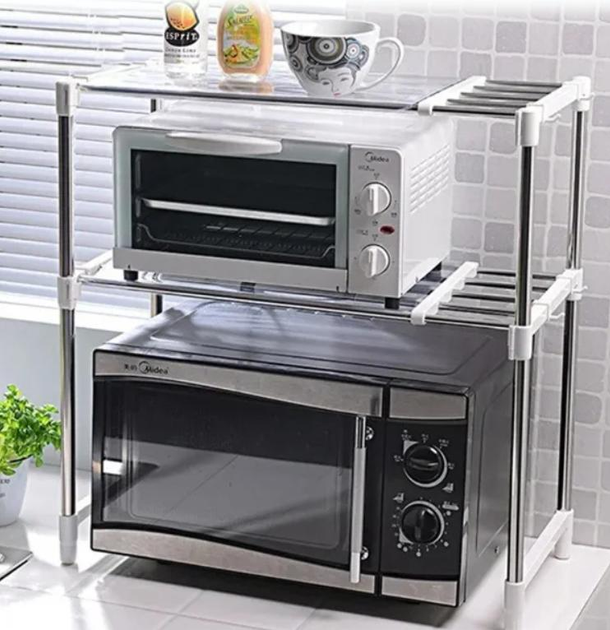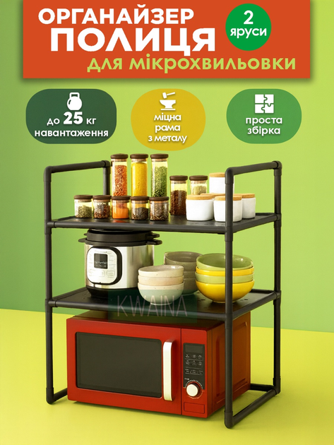 Стелаж для мікрохвильової печі розсувний 2-ярусний, кухонна телескопічна полиця-органайзер на кухню із металу та пластику, н