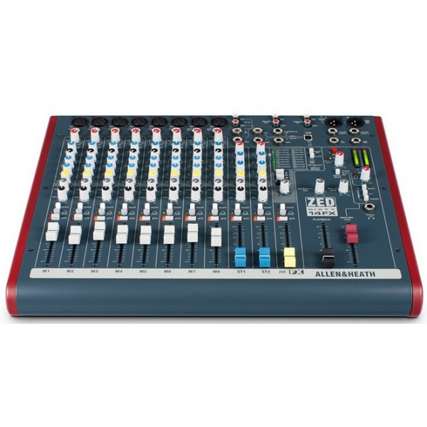 Мікшерний пульт Allen Heath ZED60-14FX ZED60-14FX компактний і ультра портативний мікшер для живого і студійного використання для соло артистів і маленьких груп. Цей мікшер - мрія гітаристів. Два з 8 моно каналів мають високо імпедансні входи (джек), які приймають нормальний і низький лінійний рівень від гітарних звукознімачів і тому гітаристи можуть безпосередньо підключати гітару в мікшер без необхідності в ді-боксах. Ці входи були розроблені з метою відтворити звук класичних лампових підсил