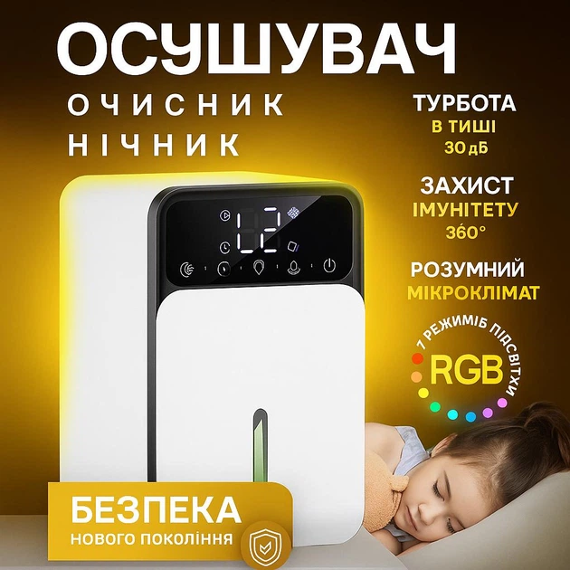 Осушувач повітря кімнатний, сенсорний екран, тихий, бак 1.2л, RGBпідсвітка, для дому, ванної, підвалу