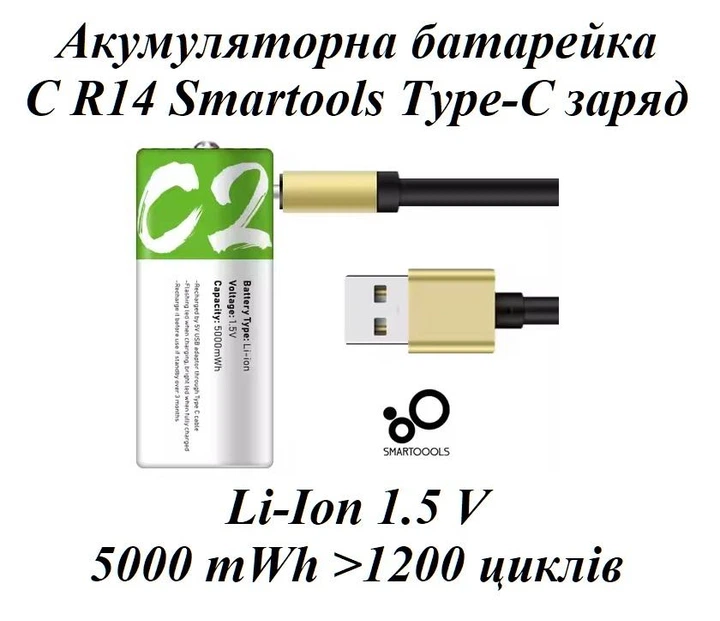 Акумулятор батарейка Тип C (R14, LR14) з роз'ємом USB TYPE-C Smartoools 6000mWh 1.5V (16221)