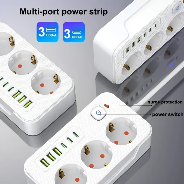 Мережевий фільтр-подовжувач Power Strip 3 + 3 USB-A + 3 USB-С 2500w (J3+6U) білий