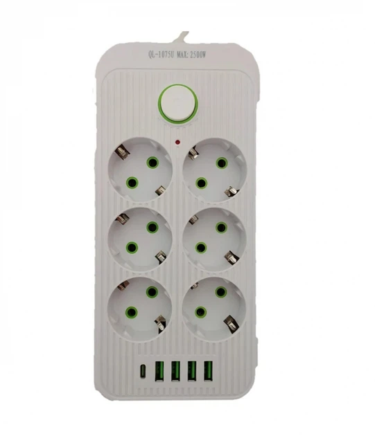 Мережевий фільтр живлення подовжувач на 6 розеток 4 USB 1 PD з перемикачем кабель 3 м 2500 Вт