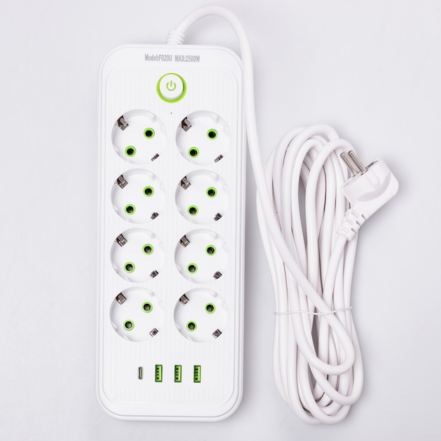 Мережевий фільтр 2.8 м подовжувач на 8 розеток з 3 USB 1 Type-C та кнопкою відключення F20U Білий HP-5-27