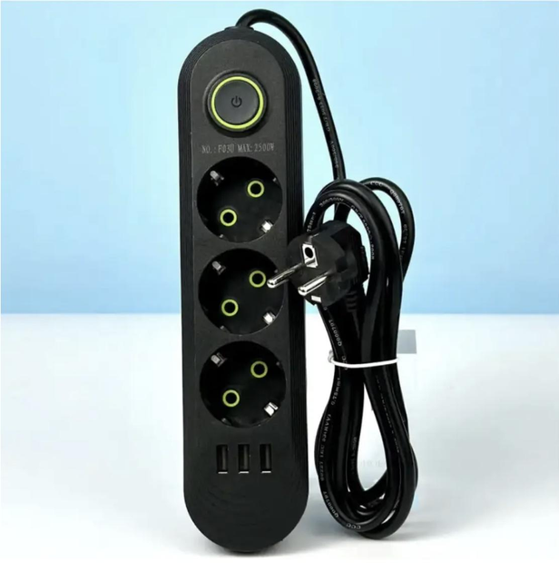 Подовжувач мережевого перенесення 2 м на 3 розетки + 3 USB UA Power F03U Чорний