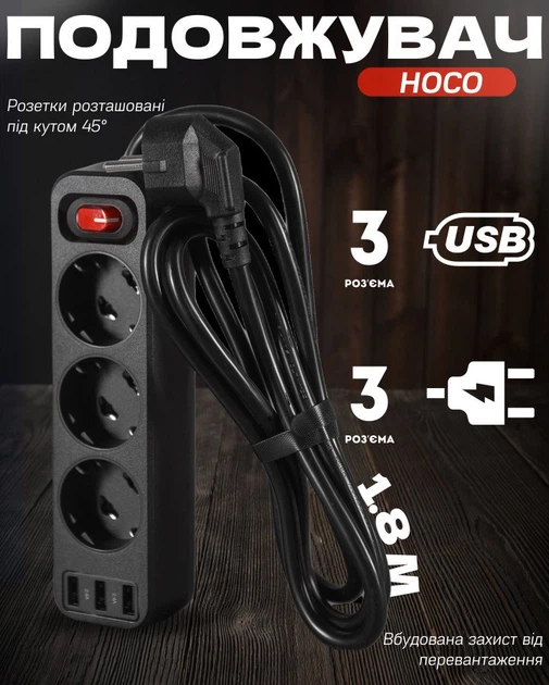 Подовжувач мережевий Hoco NS2 з USB, 3 розетки, захист від перевантажень 1.8м, кабель, 4000 Вт