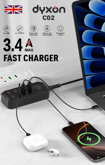 Мережевий фільтр-подовжувач Dyxon C02 4xUSB-C + 2xUSB-A FAST CHARGER 2M Black (DXN-C02-2M-B)