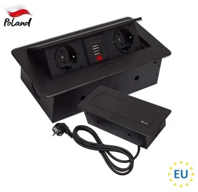 Українською: Вбудована розетка в стільницю з USB Izoxis 21446 — подвійна розетка 2230 В + 2USB, монтаж у меблі 60 мм, чорна