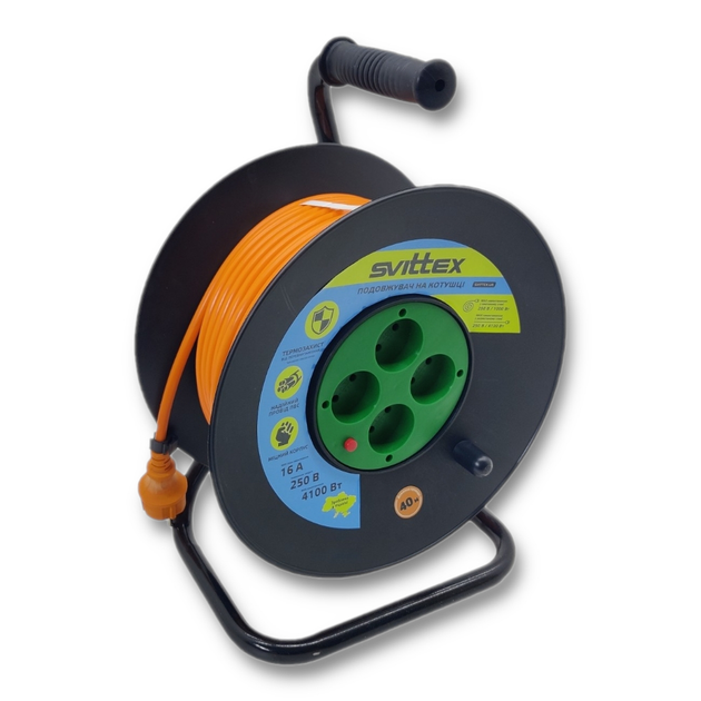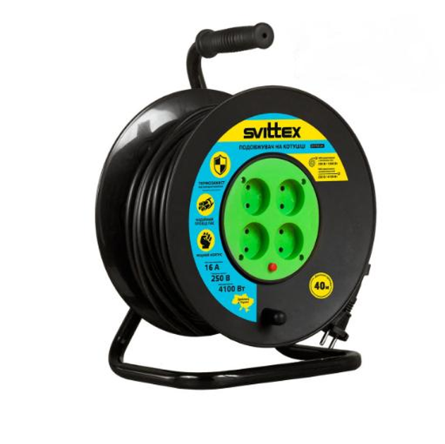 Подовжувач на котушці SVITTEX 40м серія СТАНДАРТ (без з/к) 16А 220В з кабелем 2х1,5 з термозахистом SV-006