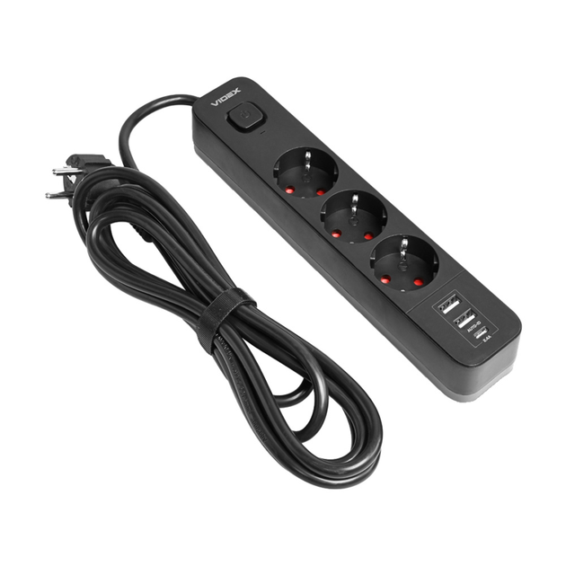 Подовжувач Videx 3 гнізда 2,4А 2USB+USB-C 3 м із заземленням і вимикачем чорний