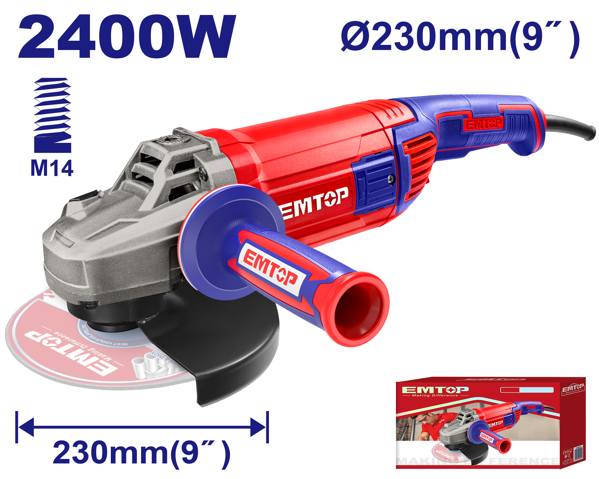 - Напруга: 220-240В~50/60Гц - Споживана потужність: 2400 Вт - Швидкість холостого ходу: 6400 об/хв - Діаметр диска: 230 мм - Різьба шпинделя: М14 - Вага брутто: 7 кг