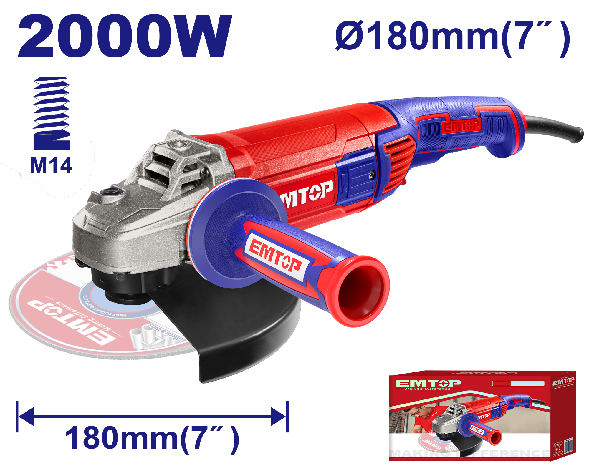 - Напруга 220-240 В~50/60 Гц - Вхідна потужність 2000 Вт - Швидкість холостого ходу 8450 об/хв - Діаметр диска 180 мм - Різьблення шпинделя M14 - Вага (нетто) 5.40 кг - Вага (брутто) 5.65 кг