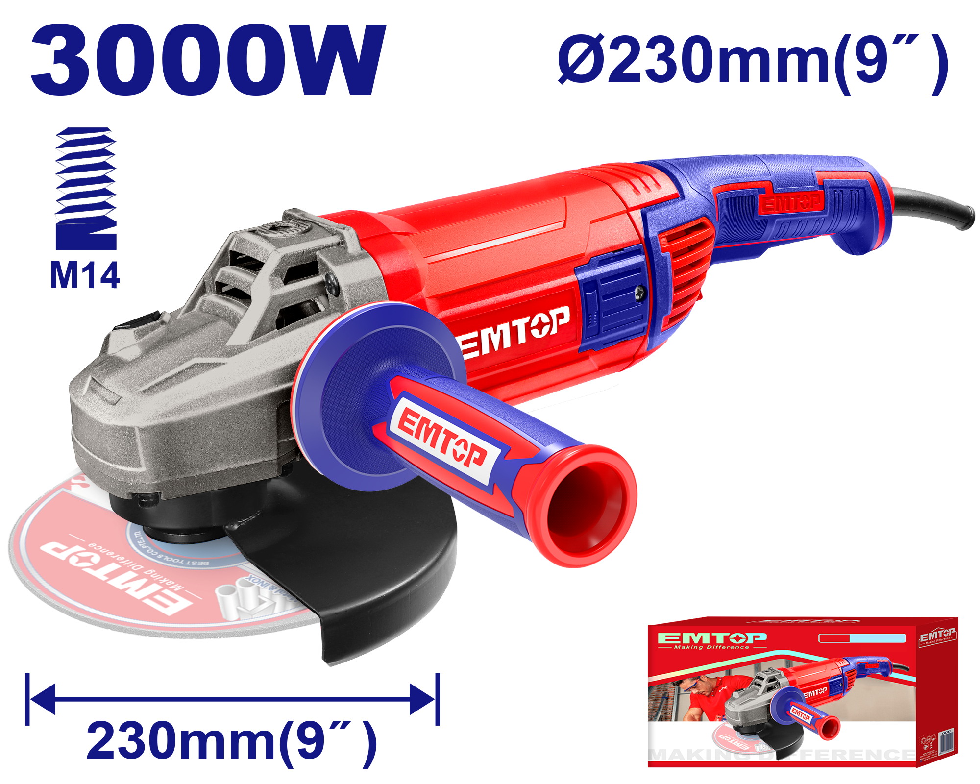 - Напруга: 220-240В~50/60Гц - Споживана потужність: 3000 Вт - Швидкість холостого ходу: 6300 об/хв - Діаметр диска: 230 мм - Різьба шпинделя: М14 - Вага брутто: 7,5 кг