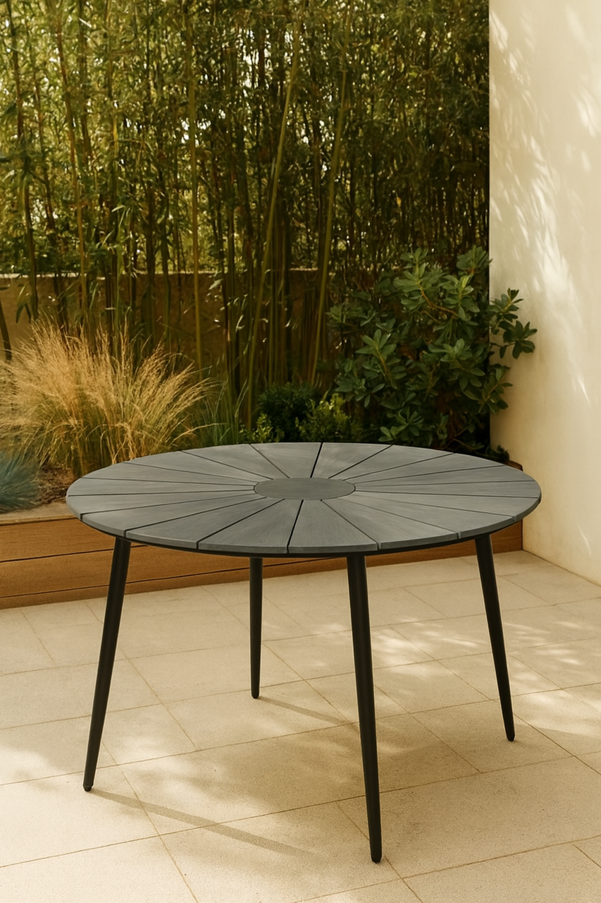 Садовий стіл Palermo від Di Volio з круглою стільницею — це універсальний предмет меблів, який ідеально підходить для облаштування саду, тераси або альтанки. Поєднання міцної, але легкої алюмінієвої конструкції з міцною стільницею з імітувального дерева поліетилену робить стіл дуже функціональним і стійким до погодних умов. Сучасний дизайн, що ґрунтується на геометричних формах і стриманих кольорах у сірих і чорних відтінках, надає меблям універсального характеру, завдяки чому ви можете легко підібрати її як до традиційних, так і до модерністських композицій, а також до іншим елементам обладнання, наприклад, стільцям або в сад під парасолькою.
