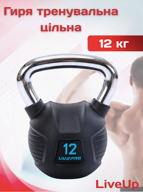 Гиря тренувальна цільна гумова з хромованою ручкою LiveUp LP8043-12 12кг (чорний)