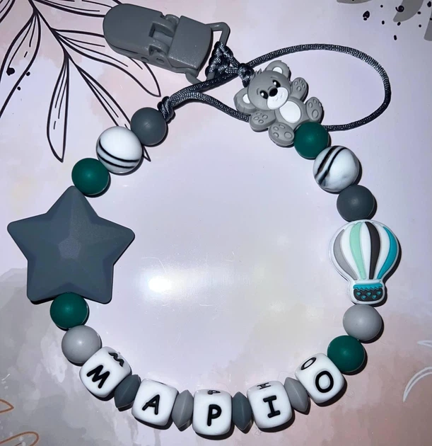 Іменний тримач для соски, силіконовий, ведмедик із зіркою 32 (ім'я будь-яке), сірий