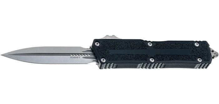 Ніж Microtech Scarab II з фронтальним викидом клинка (OTF) – це збільшена версія моделі Scarab. Крім розмірів Scarab II відрізняється більш легким і плавним ходом повзунка, який відповідає за викид клинка, форма і тип обробки якого будуть також відрізнятися в залежності від моделі.