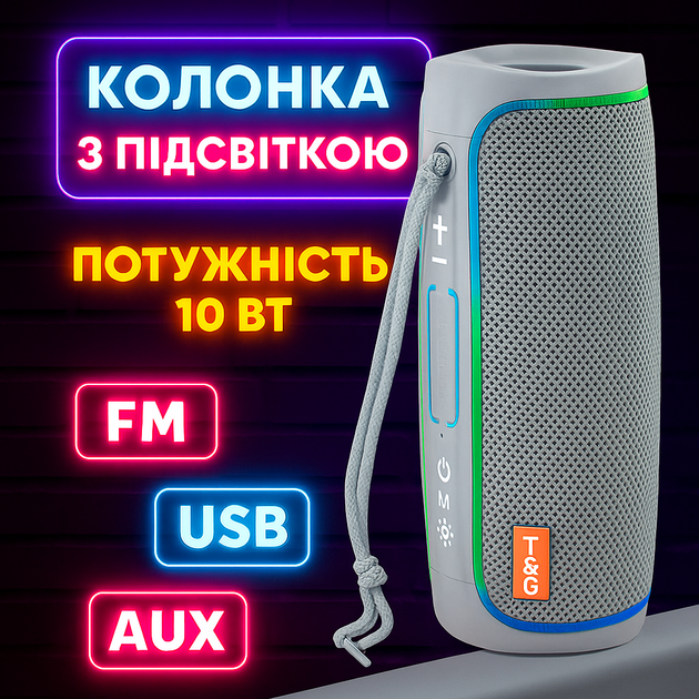 Акумуляторна Bluetooth колонка з підсвічуванням T&G 10W із FM радіо Grey