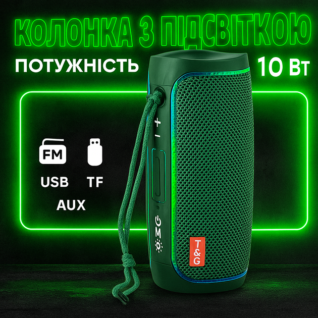 Акумуляторна Bluetooth колонка з підсвічуванням T&G 10W з FM радіо Green