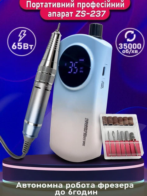 Фрезер для манікюру на акумуляторі блакитний 35000 обертів Nail Drill ZS 237 манікюрний фрезер 30W