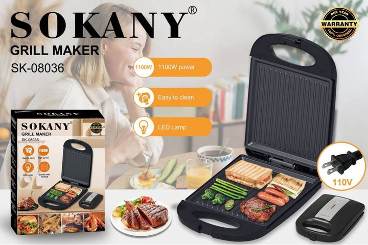 Електричний гриль Sokany SK-08036, 1100 Вт — двосторонній нагрів, антипригарне покриття, світлодіодний індикатор, компактний