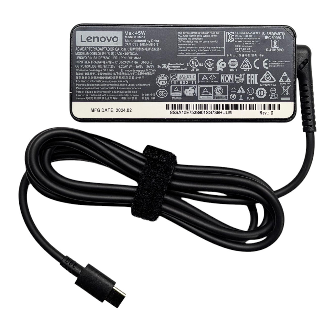 Блок питания до ноутбуку Lenovo 45W 20V, 2.25A +15V, 3A +9V, 2A +5V, 2A, разъем USB Type-C Работает через разъем USB-Type-C — подходит для многих ультрабуков и ноутбуков, которые поддерживают зарядку через Type-C.