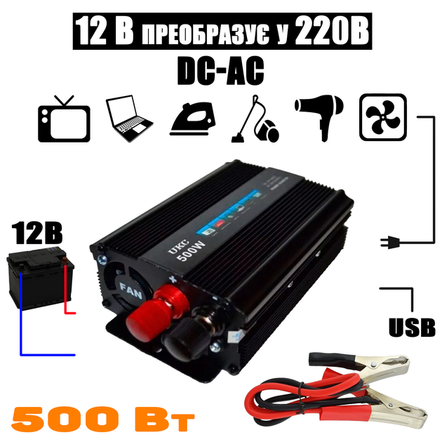 Перетворювач напруги UKC 12/220В-500Вт інвертор постійного струму із запобіжником, USB, кулер, DC/AC Чорний