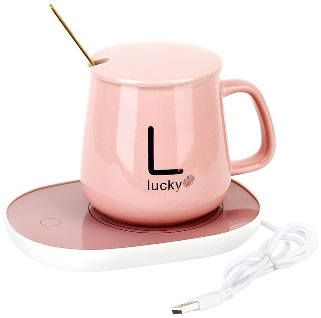 Чашка з підігрівом 350 мл керамічна рожева з ложкою в подарунковій упаковці до +55 °С