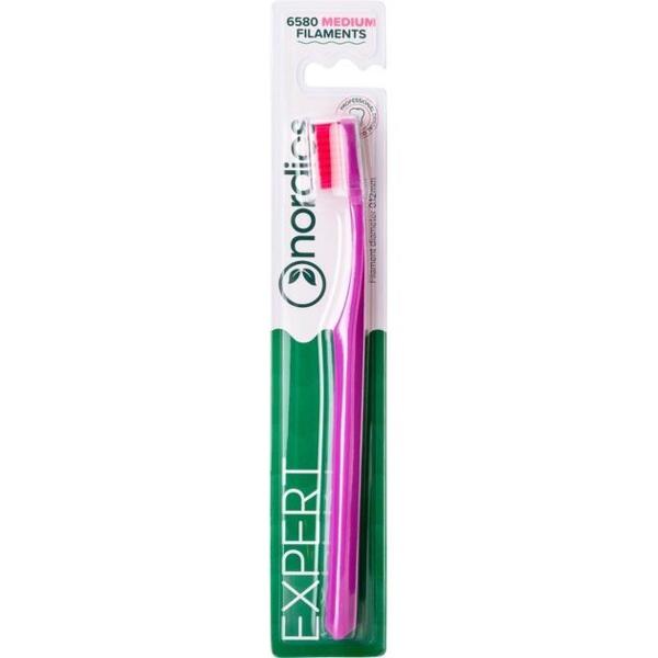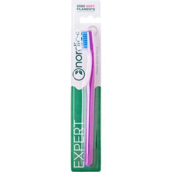 Зубна щітка Nordics Expert 6580 soft — це новітня розробка для максимального комфорту та ефективності чищення зубів. Особливості: Вона оснащена 6580 м'якими щетинками, кожна завтовшки 0,10 мм, що забезпечує м'яке, але ретельне очищення поверхні зубів. Завдяки такій великій кількості щетинок, щітка ніжно, але ефективно видаляє наліт і бруд без подразнення ясен. Щетинки проходять процес полірування, який допомагає запобігти передчасному зносу щітки і створює бар'єр для накопичення мікроорганізмів, забезпечуючи більш гігієнічне використання. Щітка також оснащена захисним ковпачком для захисту головки щітки під час транспортування та зберігання.