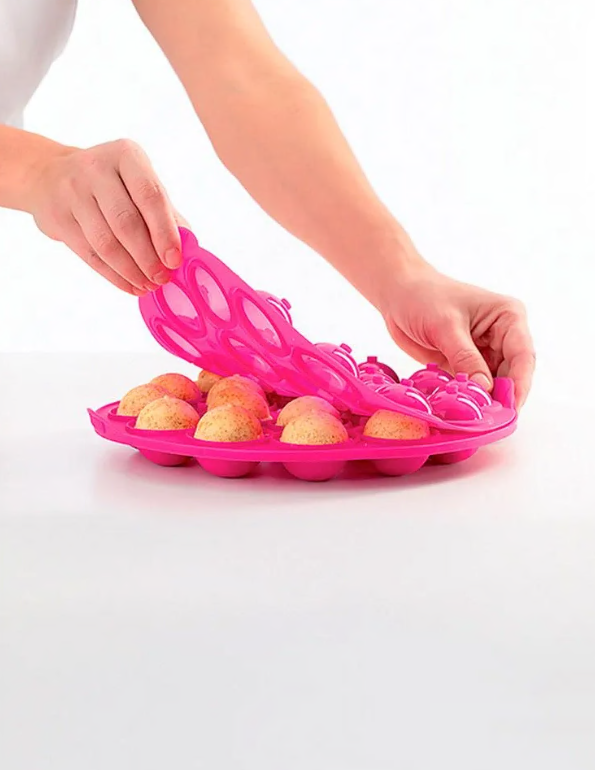 Форма розрахована на 18 кейк-попсів. Виготовлена із 100% силікону на основі платини. Високоякісний гігієнічний, легкий та стійкий до розриву матеріал. Не містить БФА. Прозора кришка дозволяє легко контролювати процес випікання. Варіативність використання – форму можна використовувати в мікрохвильовій печі для ще більш швидкої та простої випічки, а також для приготування холодних