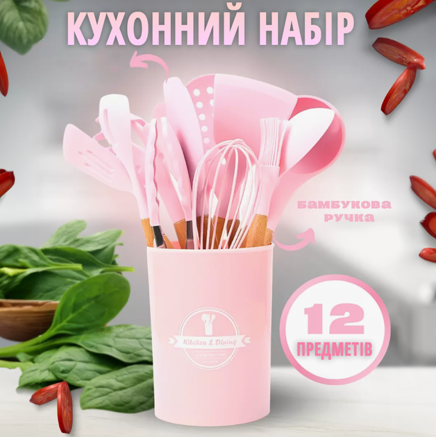 Кухонний силіконовий набір з дерев'яною ручкою з 12 предметів Ніжно-рожевий n-12215