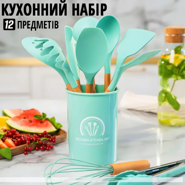 Комплект кухонного силіконового приладдя набір приладів з дерев'яною ручкою 12 предметів на підставці Блакитний