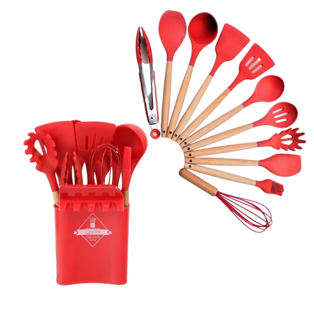 Силіконовий кухонний набір приладдя з дерев'яною ручкою червоний 13 предметів