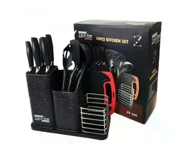 Набір кухонних ножів та приладдя ZP-045 на підставці з дошкою (14 предметів) чорний