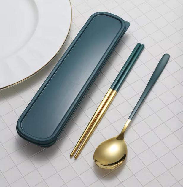 Набір металевих столових приборів палички та ложка у футлярі Золотий з Зеленим