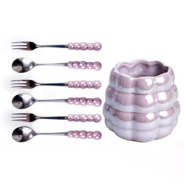 Набір десертних виделок і ложок на 3 персони з підставкою з порцелянау 7 предметів Перламутровий HP-20-62