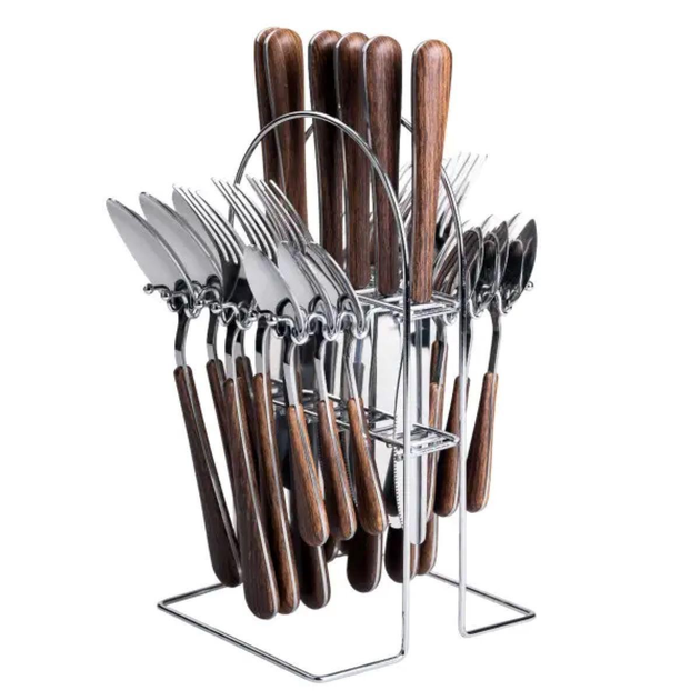 Набір столових приборів на 6 персон з дерев'яними ручками на підставці столові прибори 24 шт Срібло HP-20-1