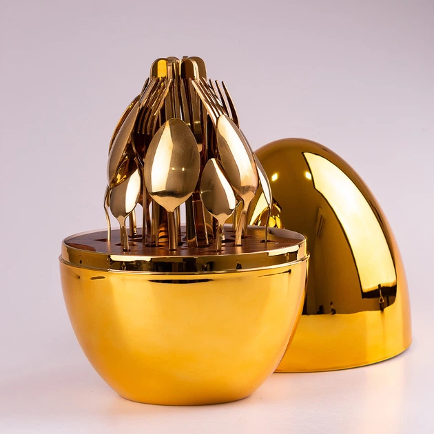 Набір столових приборів на 6 персон із нержавіючої сталі 24 штуки золотих з підставкою "Яйце" Чорний