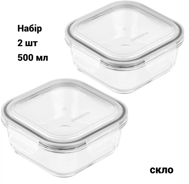 Набір контейнерів для зберігання скляних 2 шт Ardesto Gemini термостійкі квадрат 500 мл AR1250BSQ